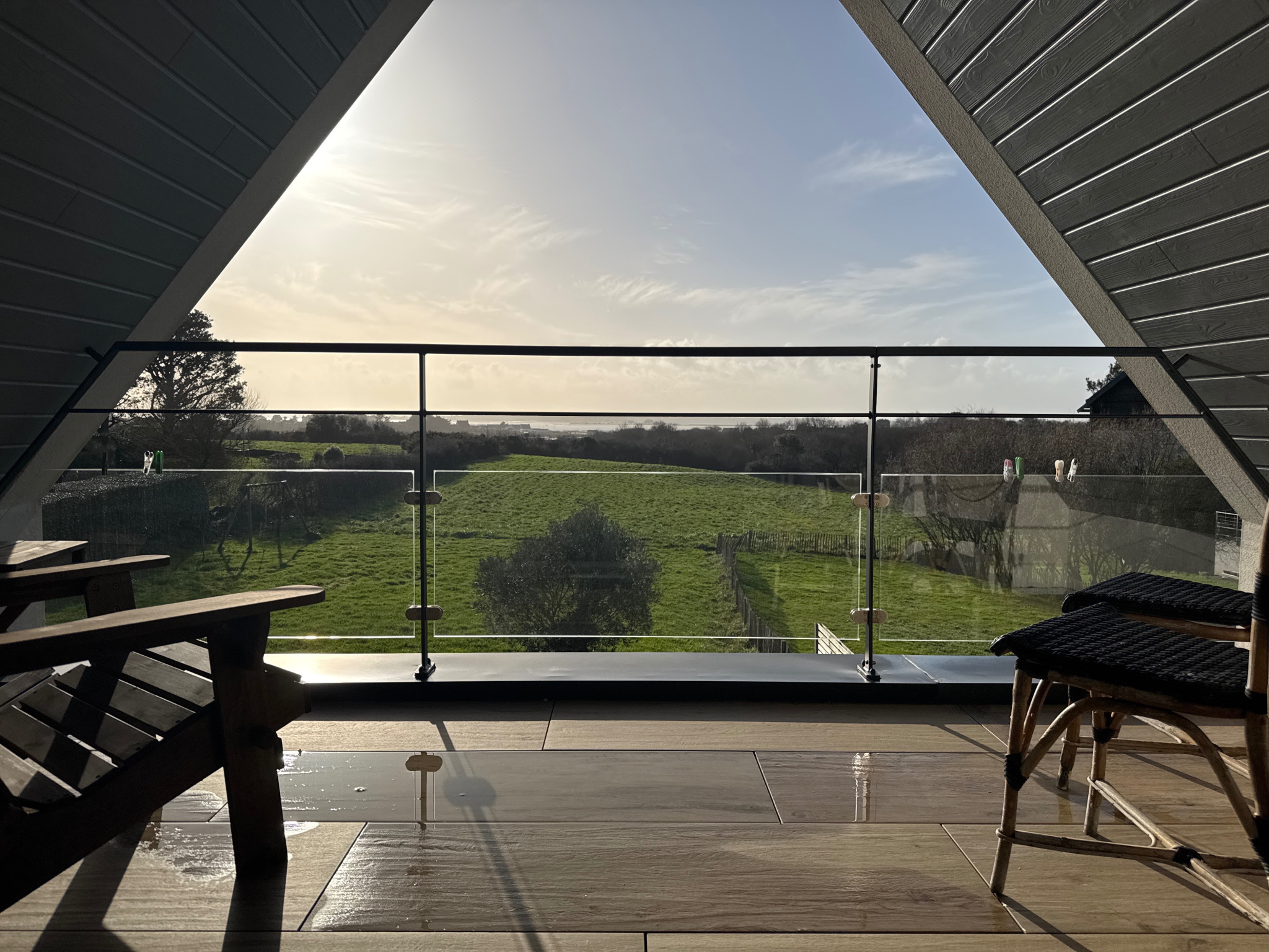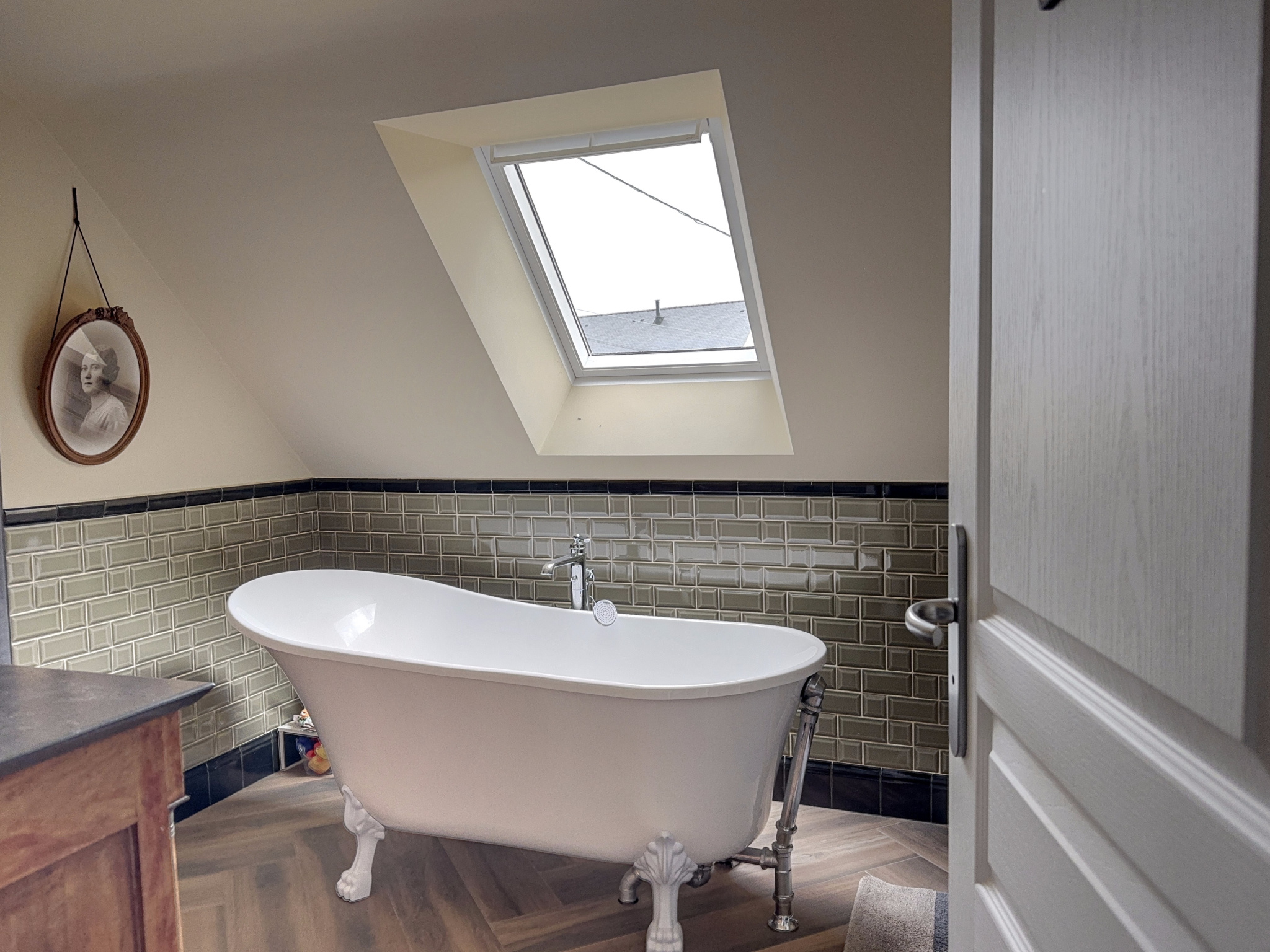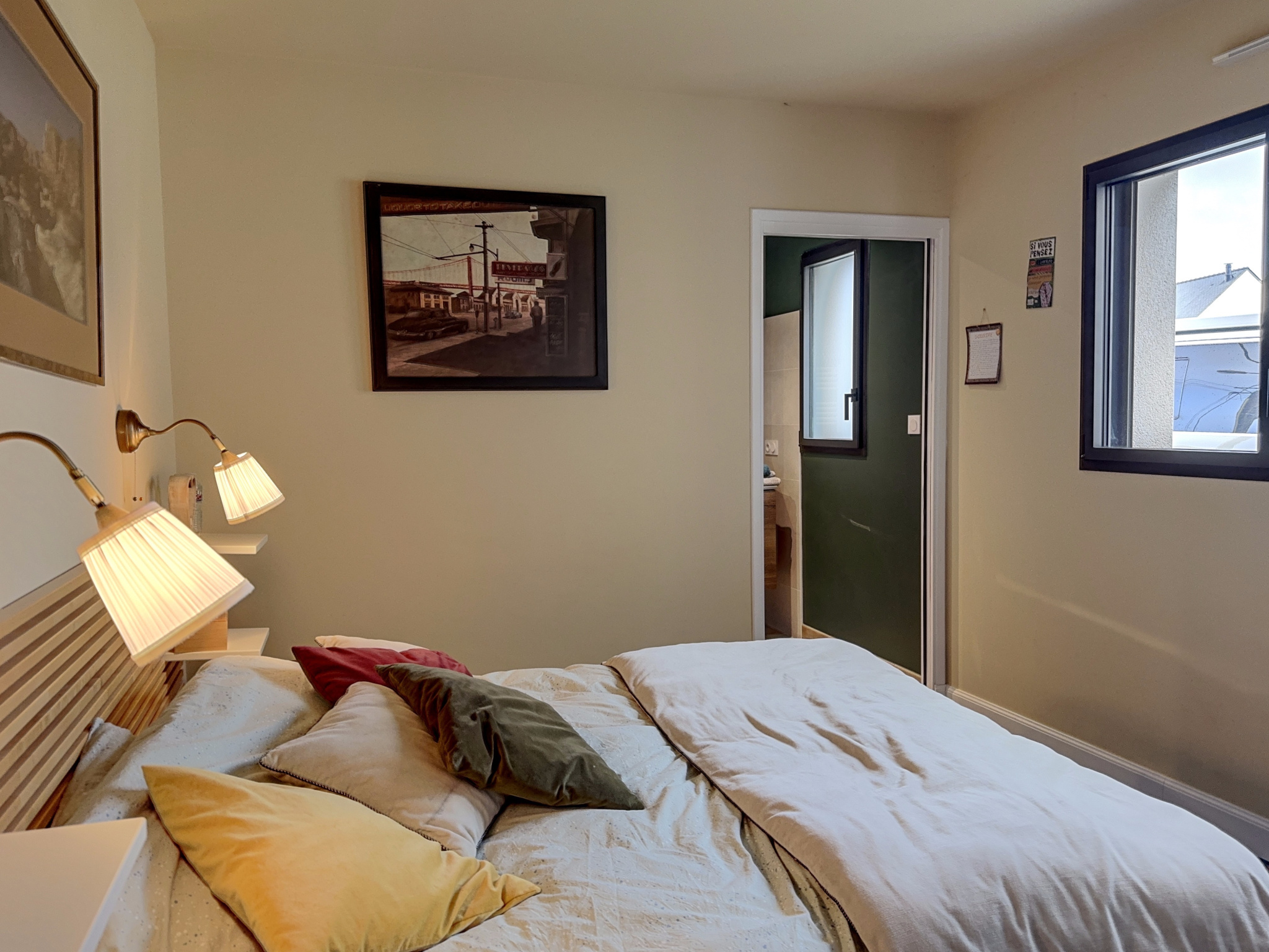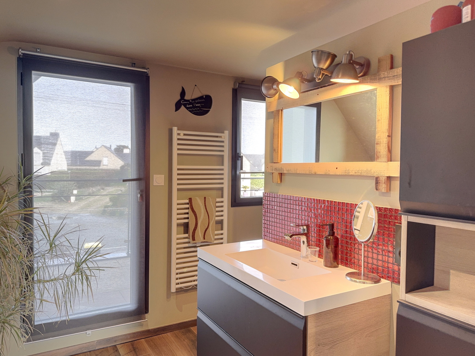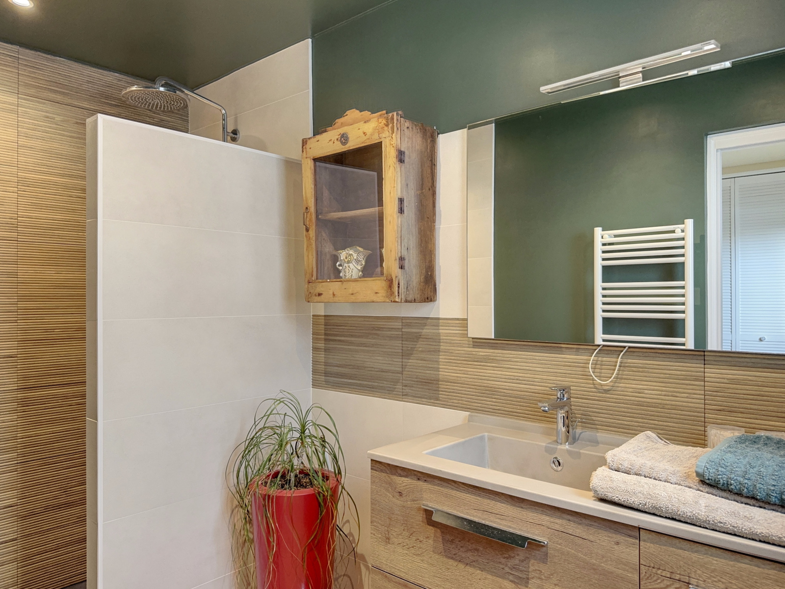L'espace de vie du rez-de-chaussée comporte également une chambre avec placards et salle d'eau privative avec une vraie douche à l'italienne, ainsi qu'un wc suspendu séparé avec fenêtre et lave-mains.